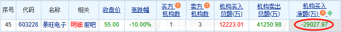 龙虎榜数据显示,买入景旺电子金额最大的前五名中,有1家机构专用席位;卖出景旺电子金额最大的前五名中,有3家机构专用席位。经统计,机构席位今日卖出景旺电子净额为29027.97万元。